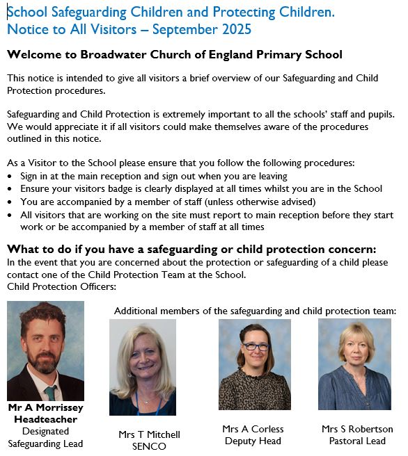 Safeguarding and Child Protection is extremely important here at Broadwater C of E Primary School to all the staff and pupils. We are committed to providing a safe and secure environment for our children, staff and visitors.
